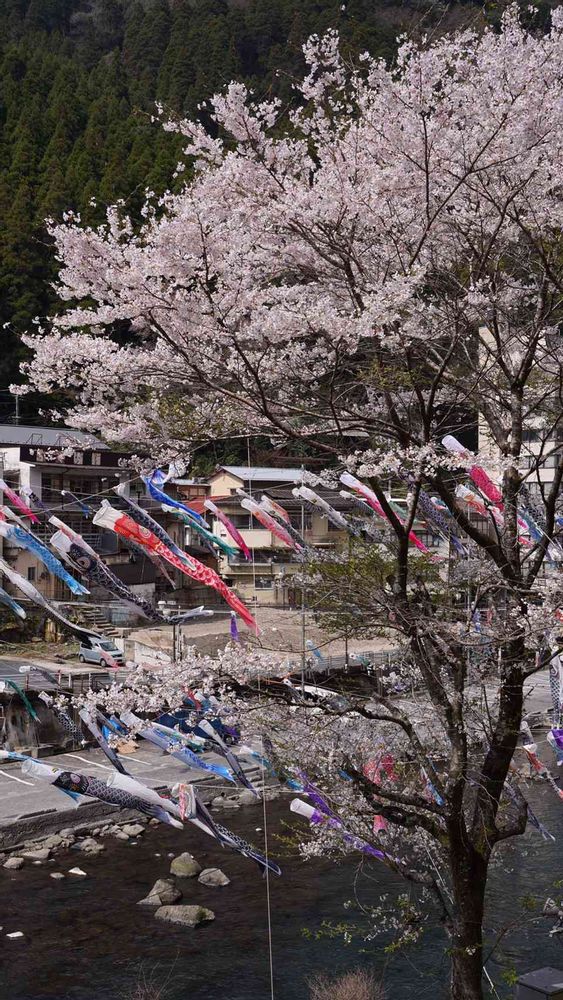 さらに昨年の豪雨で被害を受けた杖立温泉。復興には大変な苦労がありますが、今年は祭りが行われて鯉のぼりが杖立川を泳いでいるそうです。