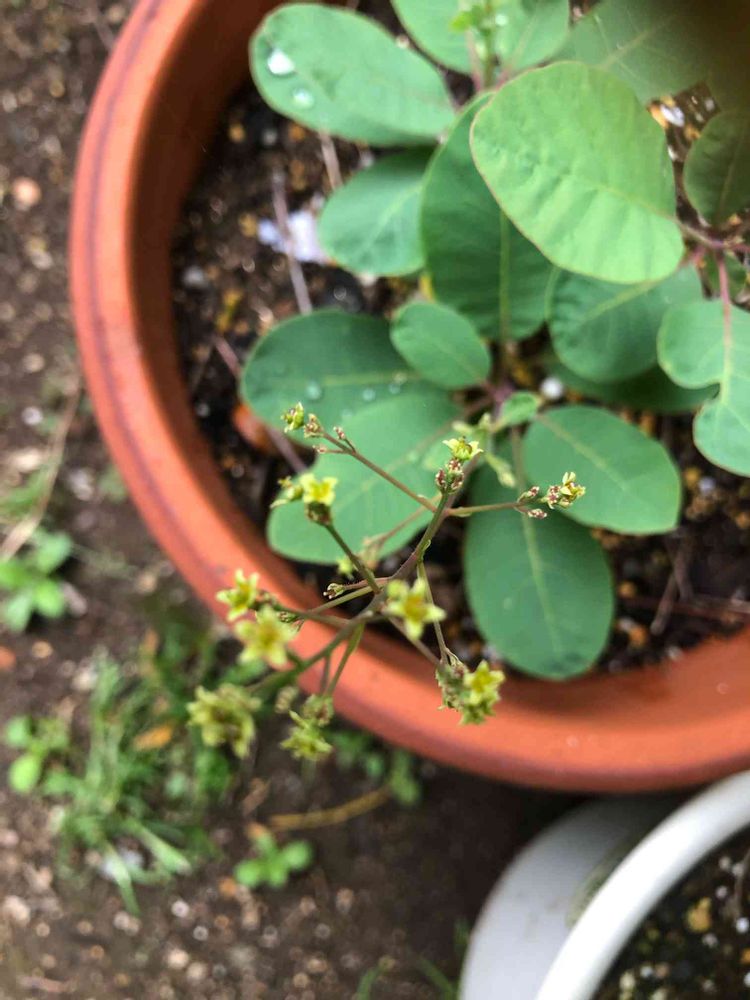 まだまだ小さい苗のスモークツリーの小さいお花が咲いてます🌼