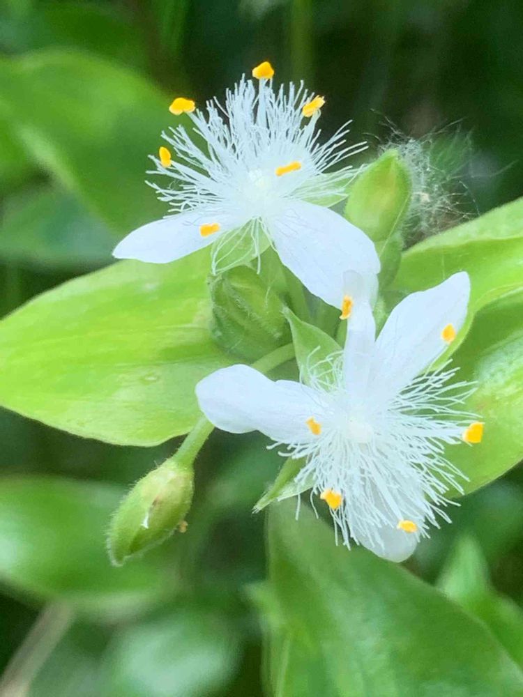 三角の形をした真っ白な花びらが特徴のトキワツユクサ(常盤露草)。