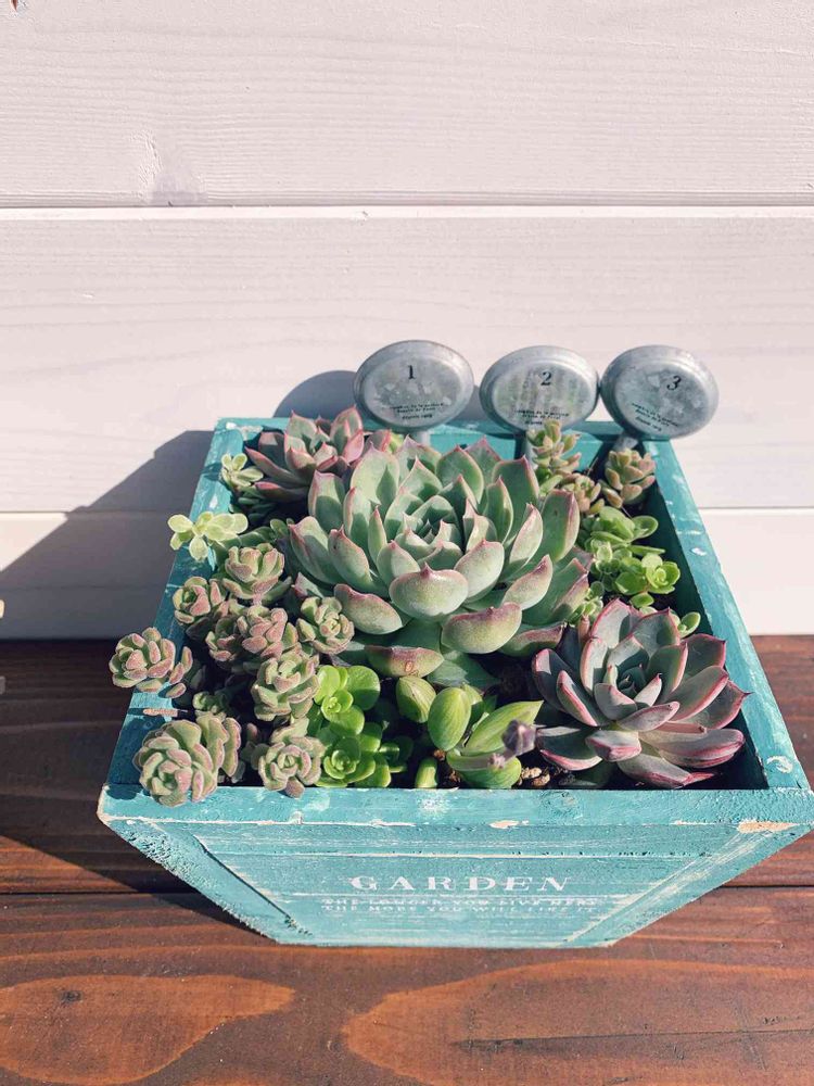ダイソーで購入した木箱に多肉寄せ植えしました♪☺️太陽の光と昨日の雨をたっぷり浴びてスクスク成長中✨