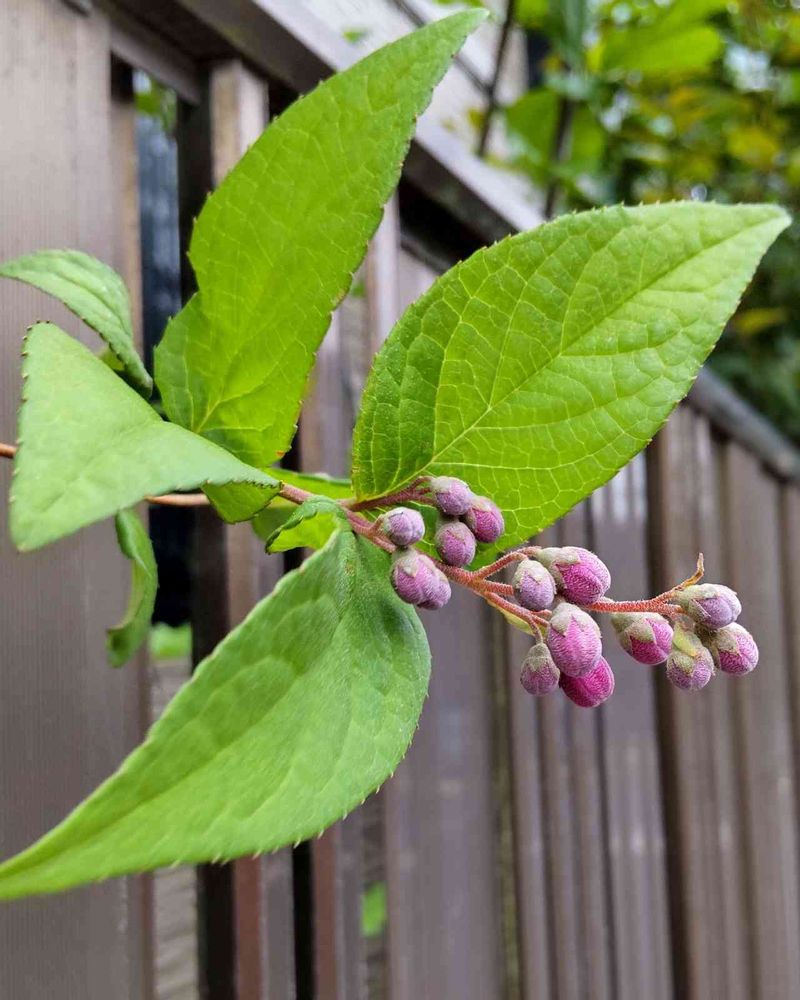 個人のお宅の塀からピンク色の蕾が顔を出しています。