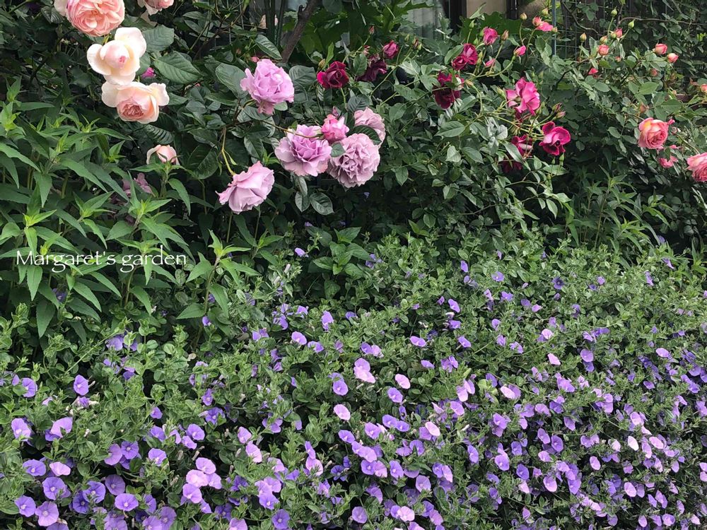 庭の前面の薔薇たちとコンボルブルス サバティウス💜昨日のpic。