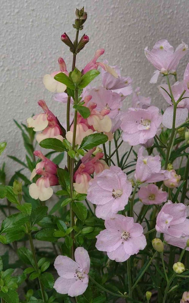 宿根サルビア サーモンイエローと種からのデルフィニウム(ピンク)の寄植え