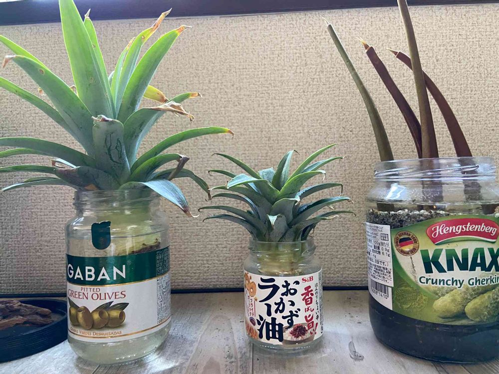 沖縄お土産パインのクラウンと拾ってきたマングローブ(メヒルギさん)