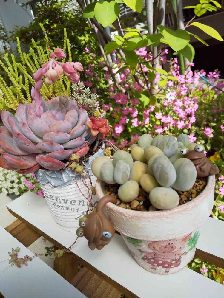 デカリンゼさん、雨ざらしで1年以上いるから デカくなったのかな〜⁉️ 🐸さん鉢にぶら下がってるよ(。'-')ウンウン 顔も、ひょうきんだよ(*´﹀`*)フフッ♪