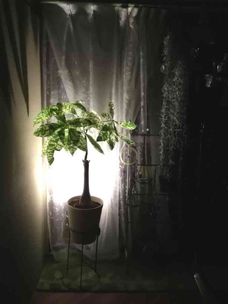 クリップライトをフラワースタンドに結束バンドでくくりつけて、植物を見上げるように照らしただけ。