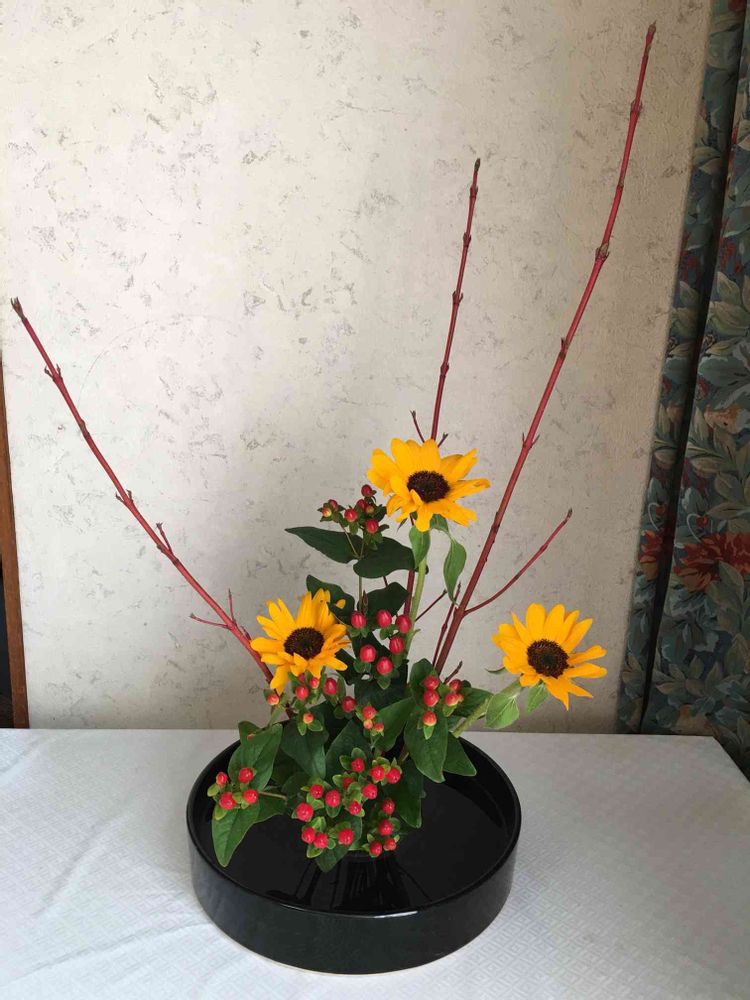 今回の花材 サンゴミズキ、ひまわり、ヒペリカム