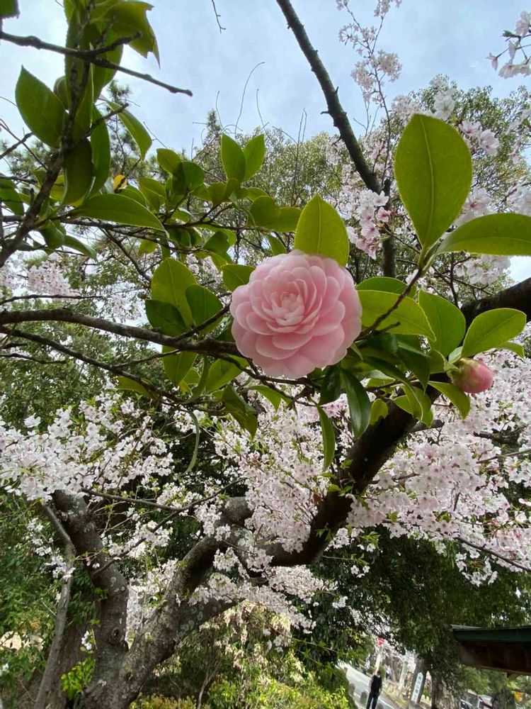 満開の桜の横で、乙女椿が可愛らしく咲いています❤
