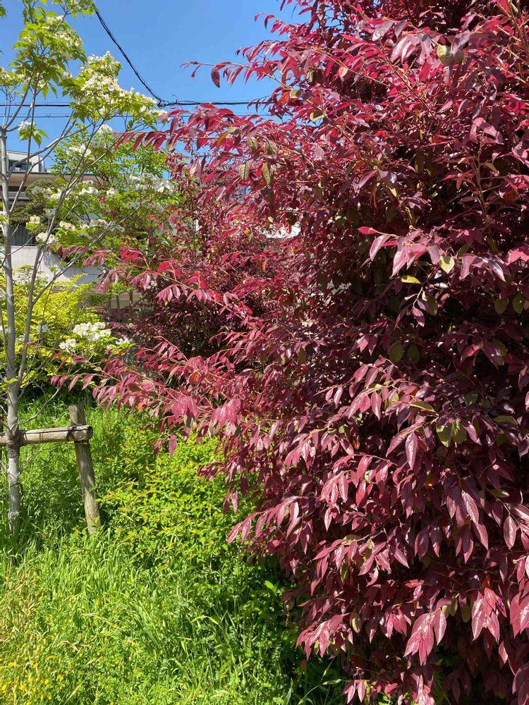 花が終わると葉っぱが赤く! 白花のトキワマンサクは緑の葉っぱなのに、不思議。