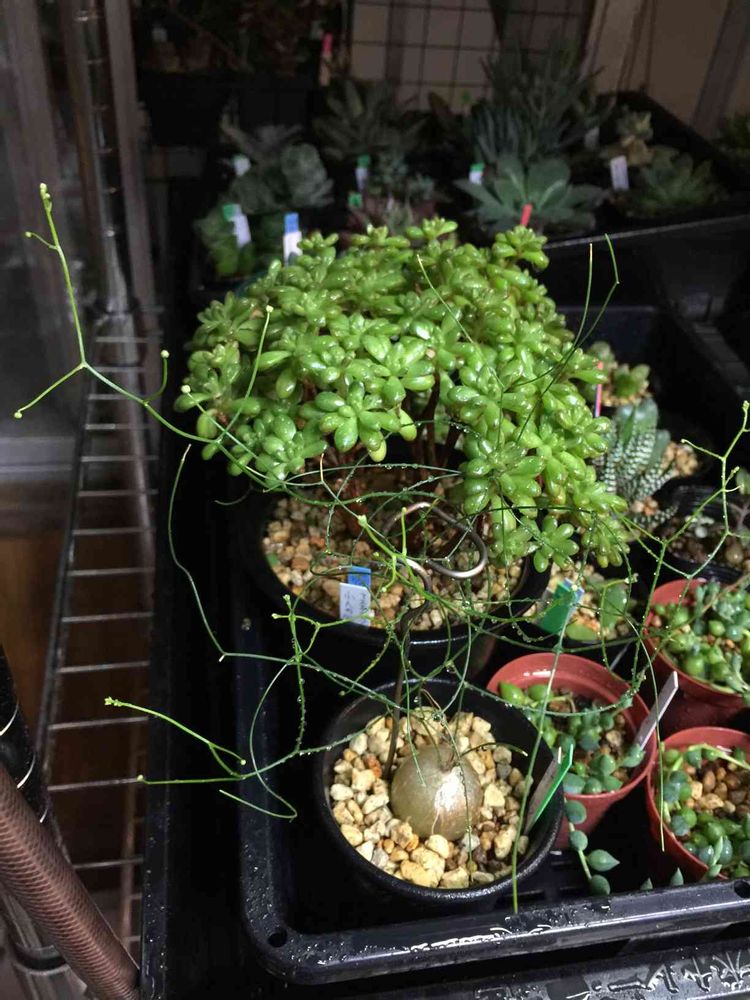 葉の状態が少しだけ立派?1〜2本から枝分かれして売れ残りのコよりいい感じでした🎶 犬嫁さんのお返事を読む前だったので購入を一旦我慢し帰宅したのですが、アルミ線で支えてのくだりと移動の時に折れやすいとのことで、ベランダで多肉のお世話しながらお尻で葉っぱもいでるような私が、狭い我が家のベランダで育てられるのか心配が増えてしまいました〜🥺
