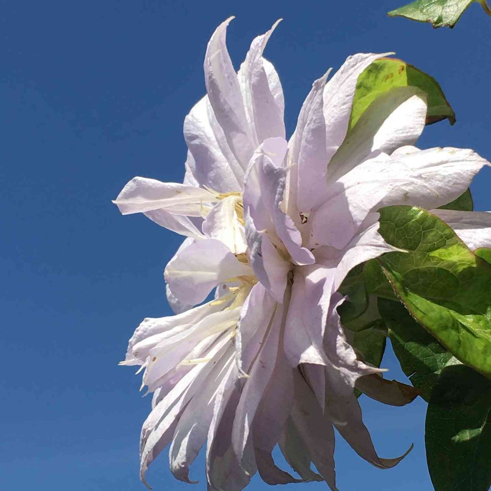 GW明けの青空。今年もまたオリーブの木を上りつめて、行き場を失ってしまった。来年はツルを綺麗に巻いてあげたい。