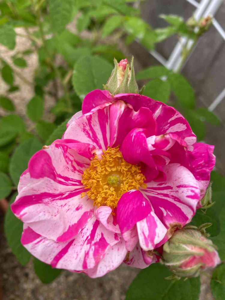 つるバラとは知らずに選びました^_^見よう見まねの誘引で初めての開花を迎えましたロサムンディー🌹です