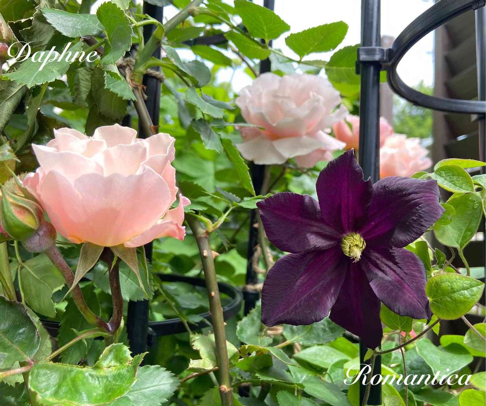 大人色のクレマチス💜ロマンティカさんと優しいお色のダフネ🌹さんのコラボ♡素敵ですね〜😉