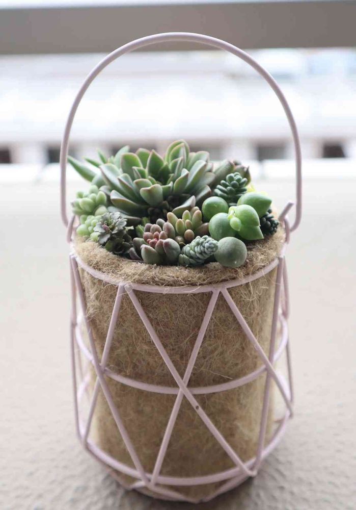 かわいい寄植えですね💗ピンクのカゴにグリーンが映えて、とっても愛らしいです💕