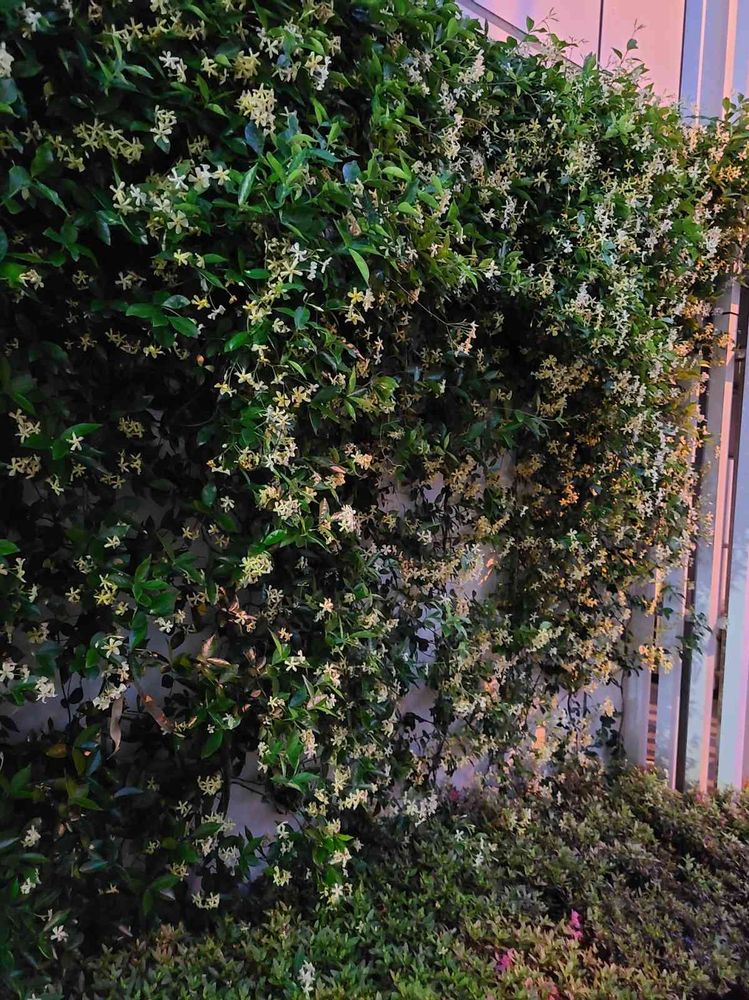 神田裏通りビルの外壁装飾の植物📱夜。白い小さなお花がイッパイ咲いてました。