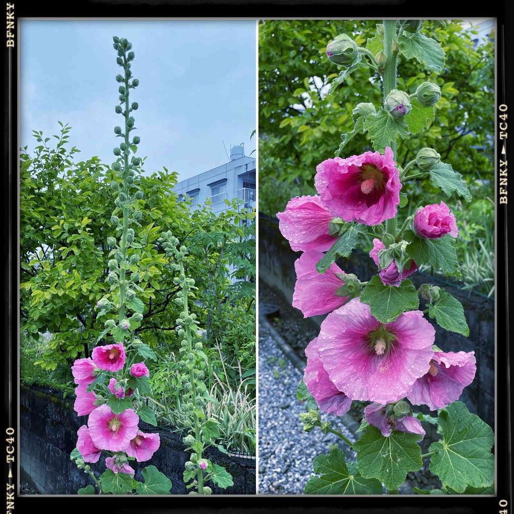♡友人宅の庭に咲いている、薄紅色の葵が満開になりつつあり、小糠雨に濡れてとても綺麗な色合いで咲いてますデス🐶
