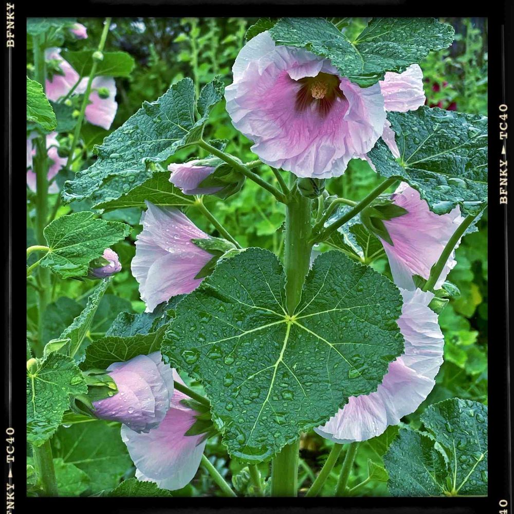 ♡友人宅の庭に咲いている、薄紅色の葵が満開になりつつあり、小糠雨に濡れてとても綺麗な色合いで咲いてますデス🐶