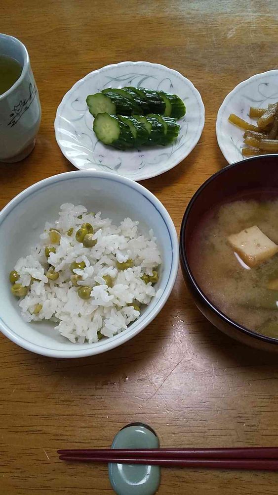 うちは 晩御飯もお豆ご飯に作った 春菊のお浸し 南蛮漬け!