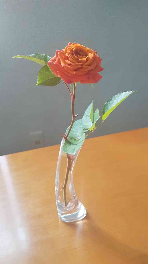 先日のオレンジ色のバラが咲いたので、カットして家の中に飾りました。