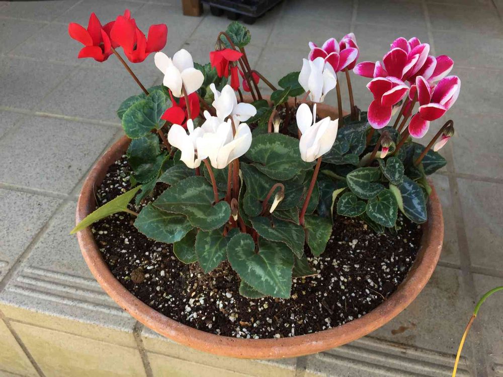 赤いシクラメンは2株残りました。昨年の株です。今年は白とぼかしを加えました。
