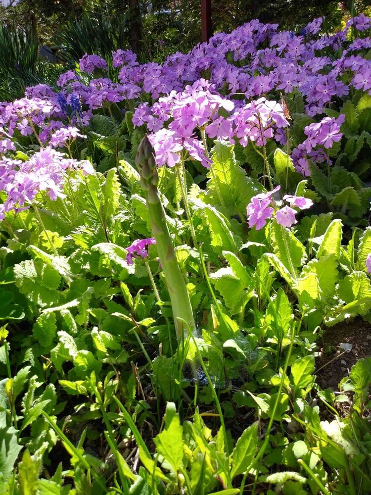さくら草の間にアスパラガスが出ています