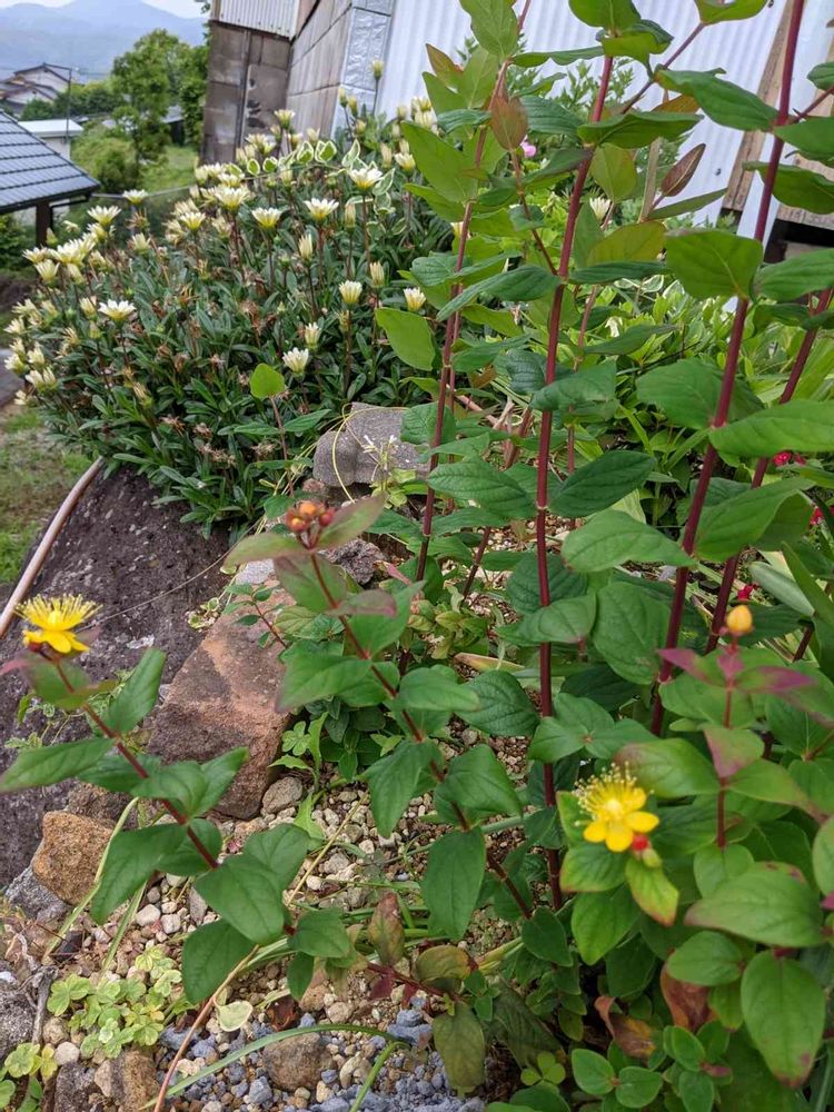 ヒペリカム!先の方は、ガザニア?車庫付近も、花盛り。