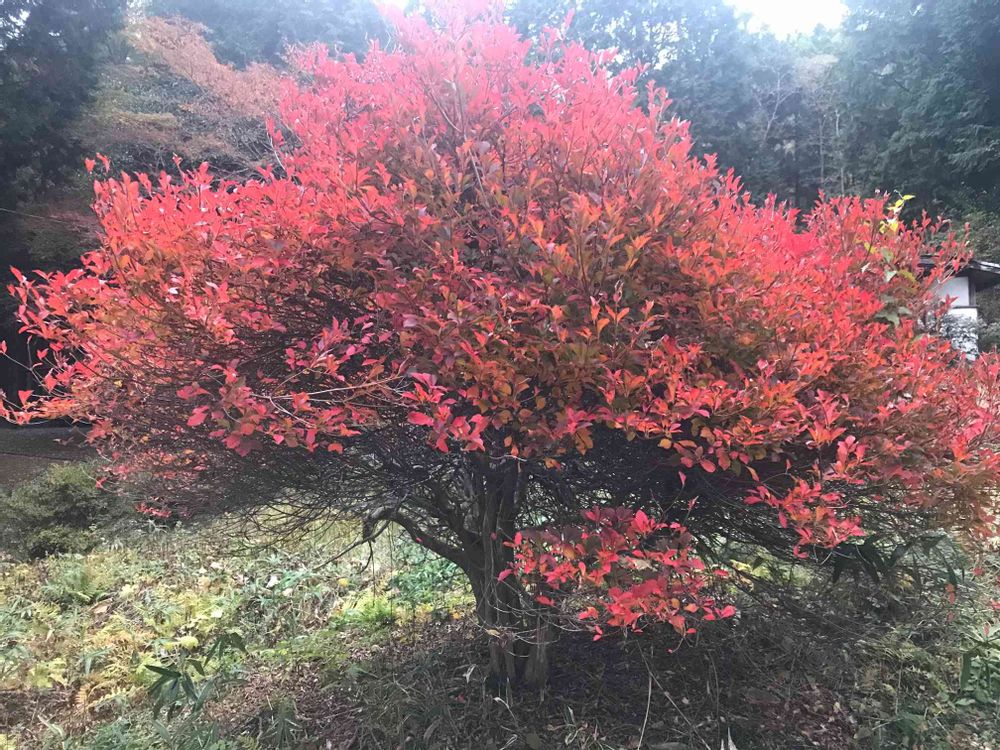 もっと明るい日中写真におさめれば良かったのですが、お向かいの家の灯台躑躅紅葉、今が一番綺麗です。