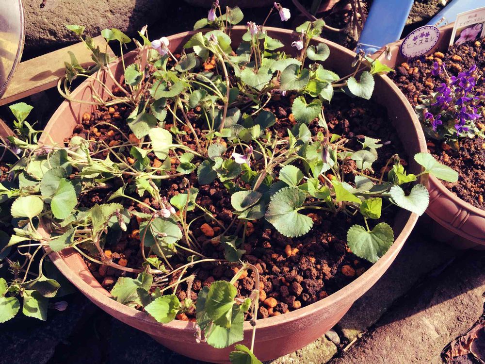タチツボスミレ 我が家の庭の鉢に共存するかのように、次々とスミレの葉が出て、今は次々と花が咲き出しています。何鉢かに出ていたスミレをひとまとめ。