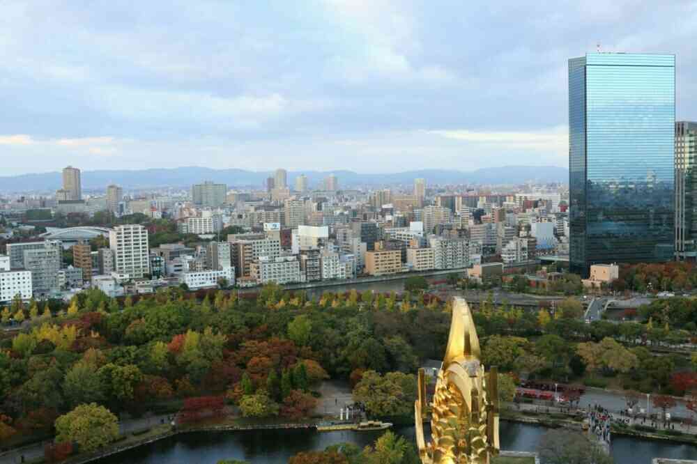 大阪城天守閣より、街と紅葉とシャチホコ。