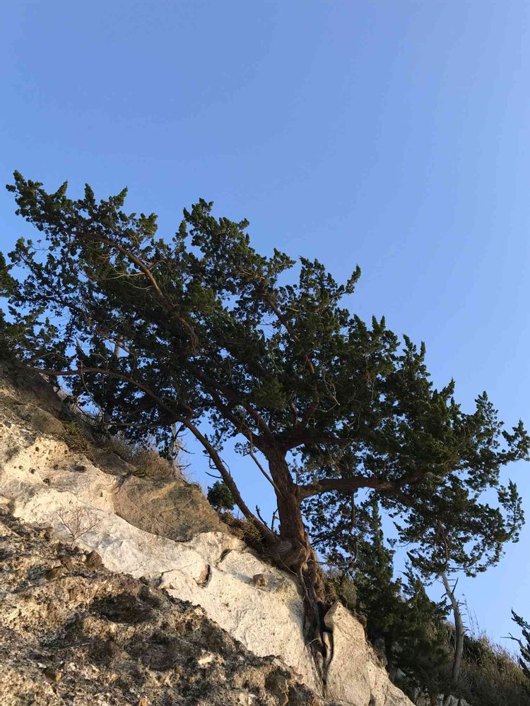 海沿いの切り立った崖に しがみつくように生えるビャクシン。