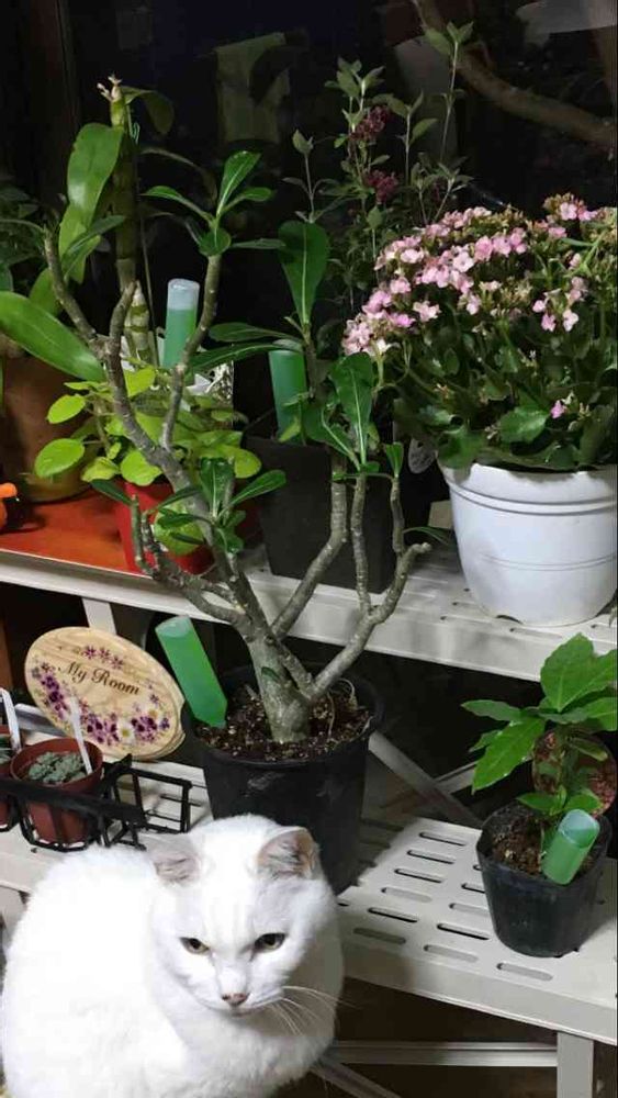 キッチンの窓辺に置いてる植物さんの中に混じってポーズ撮ってるラッキー王子🤴でーす(^ν^)