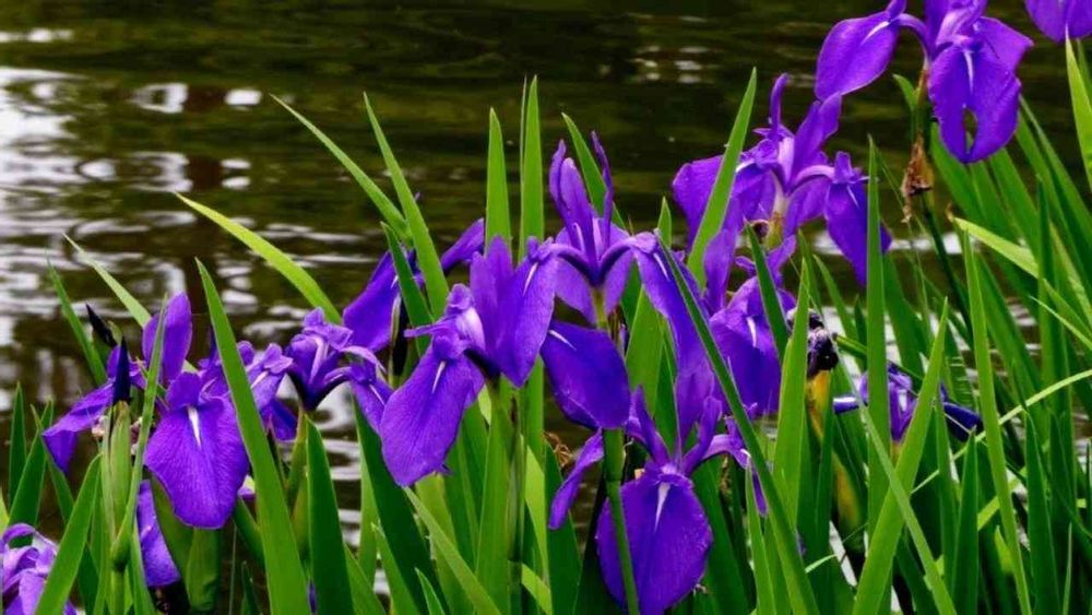 丹波亀山城址(現 大本本部)の内濠跡の杜若が見頃を迎えています。