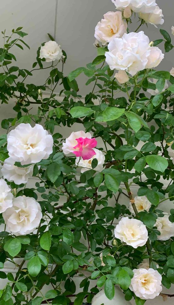 真っ白の薔薇の中一輪だけピンクの色が🌹
