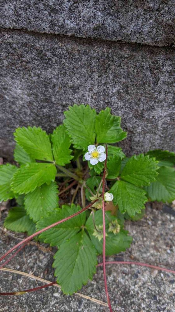 ど根性ワイルドストロベリー。元々植木鉢の苗からランナーが伸びてたのですがそれがコンクリートの隙間で根がついてしまいました。本体は枯れてしまったのですが今年はこちらの苗からいちごを2つ食べました。またお花が咲いているので楽しみです。