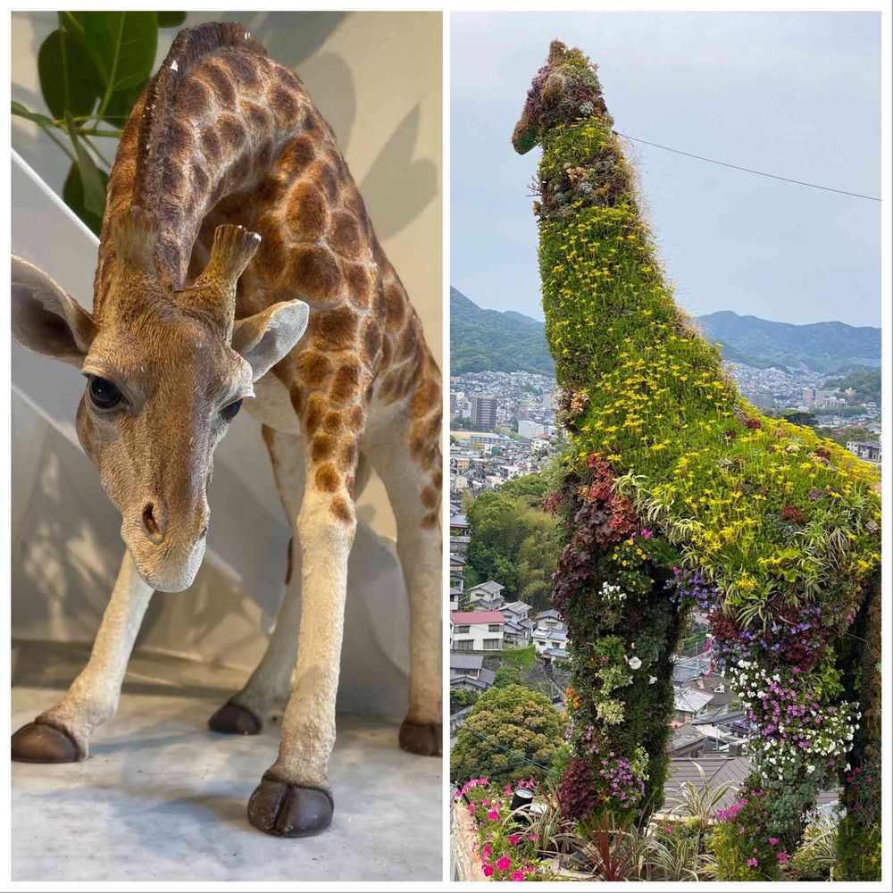 右は屋外の、高さ5メートルの花咲くキリン🦒体中に花を纏って、町を見守っています🌼近くで見ると、迫力がありますよ😄