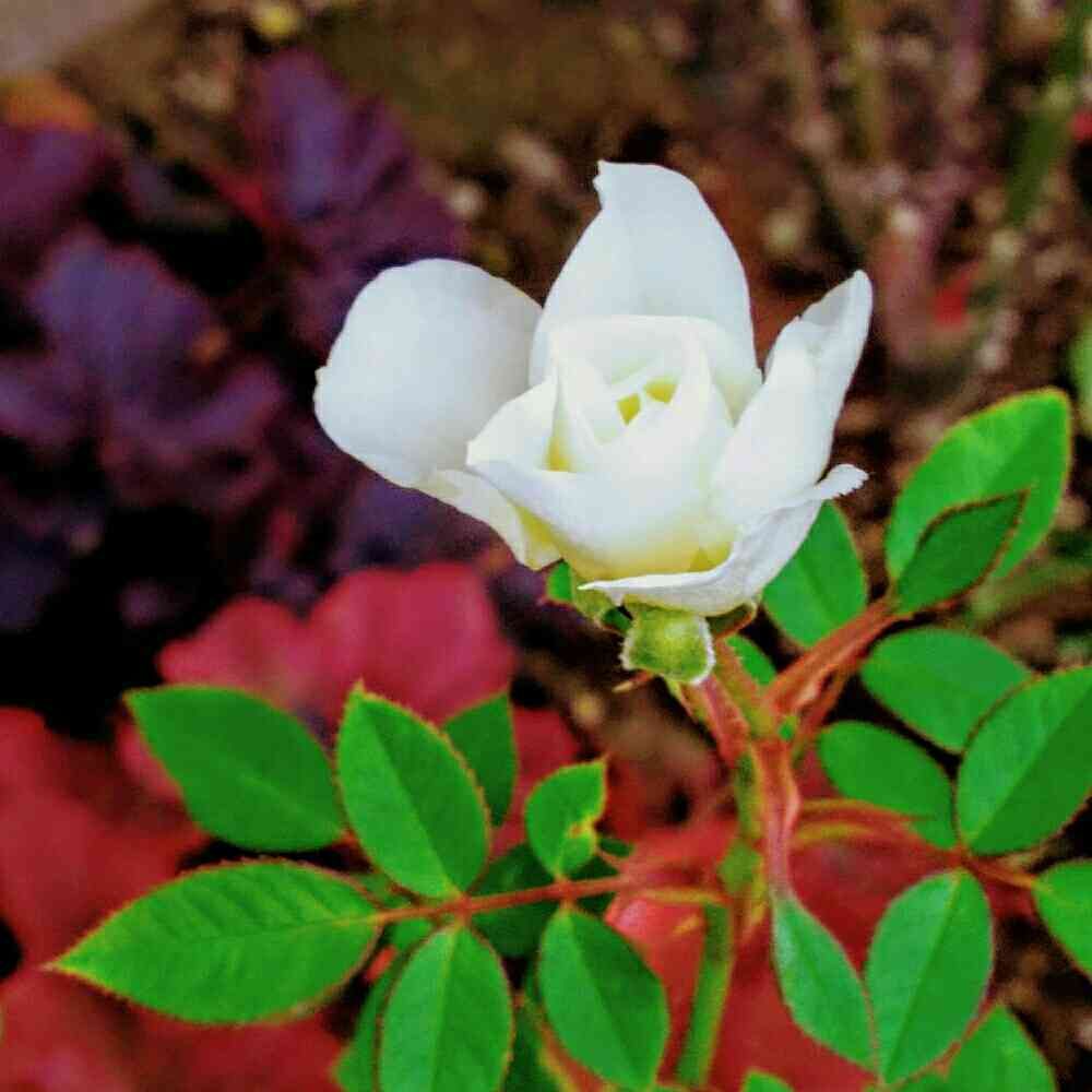 そんな中、色づいたヒューケラを足元に、ミニバラさん咲いてます💓