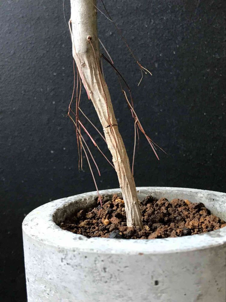黒法師の足元です。幹の痩せた部分はおそらく水を吸い上げる事が出来なくてなってしまっているのでしょう。幹の生存部分から新たな根を下ろして土に向かっています。着地後土に潜り込んで養分を吸い上げようと目論んでいるのでしょう。がんばれ!