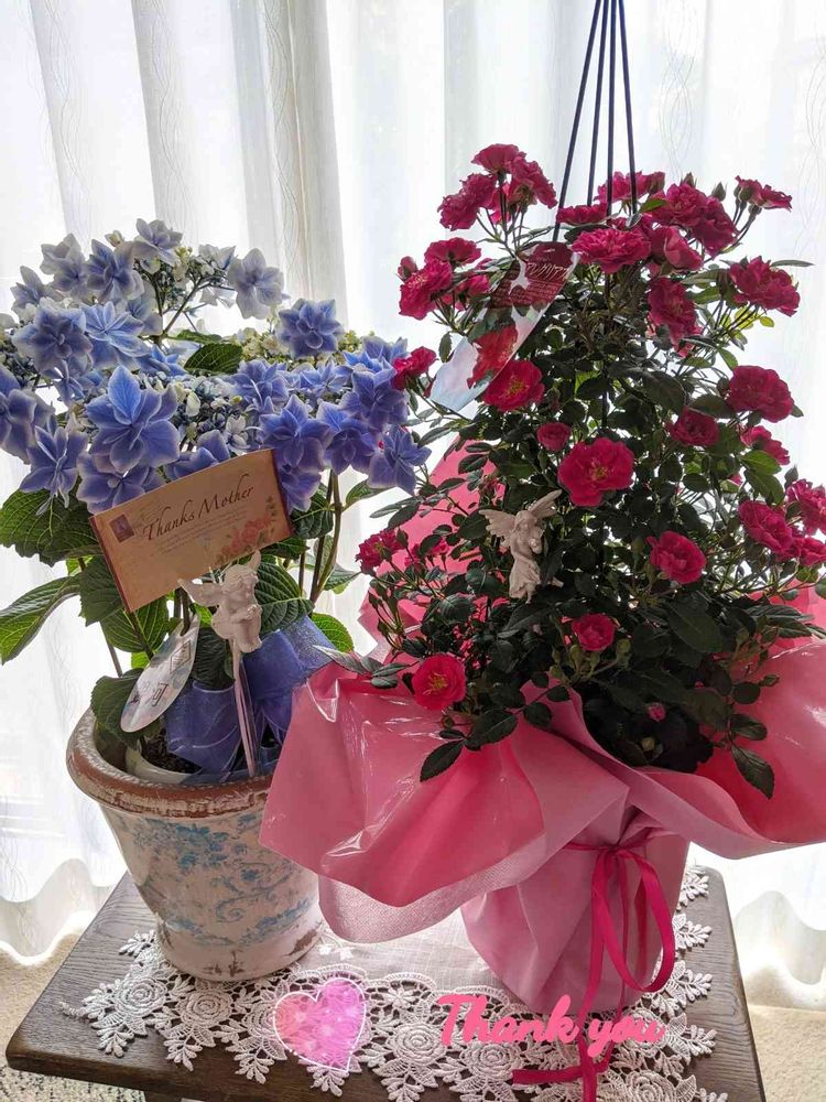 こんばんは♪母の日プレゼント🎁、すてきなアジサイとバラ🌹。お母さんの好きな物をわかっている、優しい娘さん達ですね^o^。