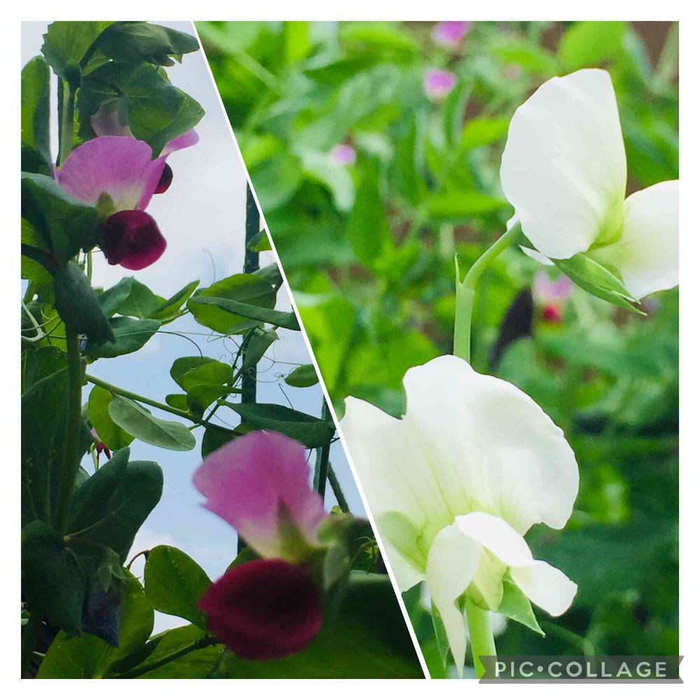 今、えんどう豆とツタンカーメン豆の花がきれいに咲いています。