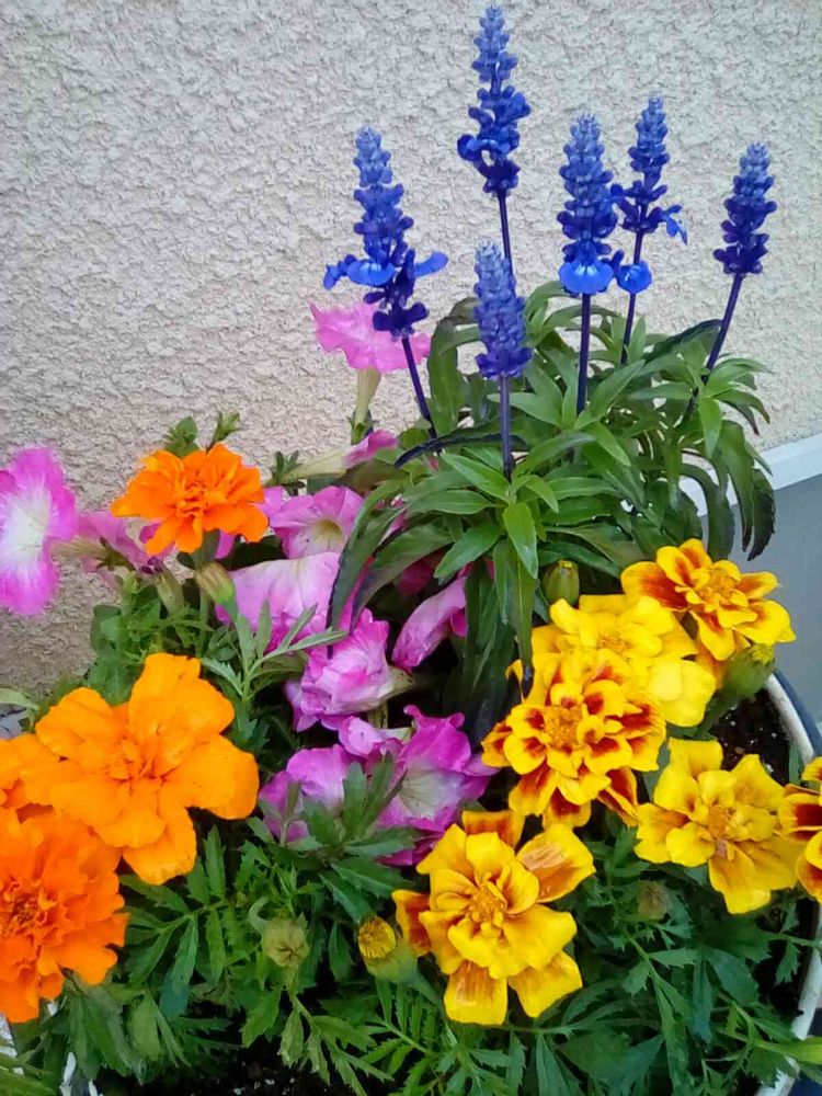 ブルーサルビア、マリーゴールド、ペチュニア、オレンジ色のマリーゴールド。