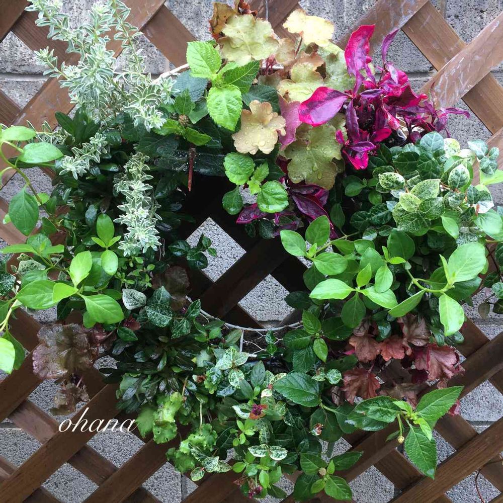 ランタナ、千日小坊、ヒューケラ、アジュガ、ハツユキカズラ、などなど、リーズ型も3回目、植物もほとんど有り合わせで作ったリースです(^^)