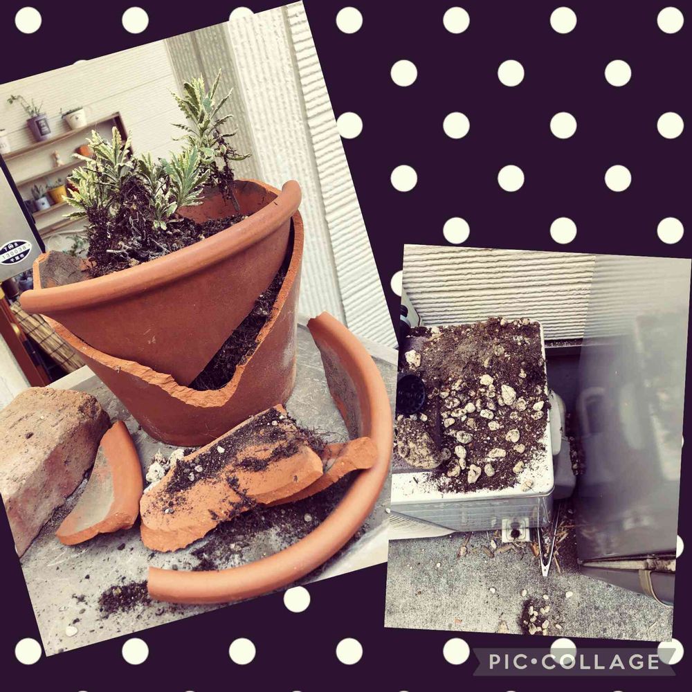 班入りラベンダーのメルローの入った鉢を旦那が落としました(ノ`Д´)ノ.:・┻┻