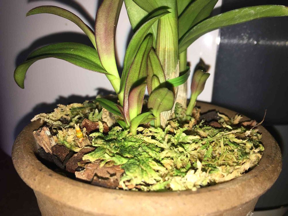 デンドロビウム ビギバムの新芽🌱が今頃いっぱい出てきました。暖かい時期に湿度が足らなかったのでしょうか?😅😅😅