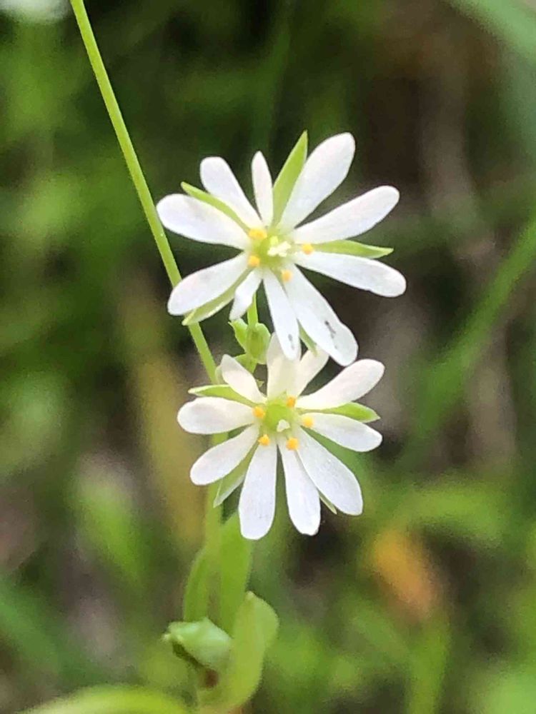 ノミノフスマ ですね🤗ナデシコ科ハコベ属の一年草(越年草)。野原や畑などに生えるハコベのなかまの小さな雑草で、細い茎でやや立ち上がって細い葉をつけ、白い小花を咲かせる。