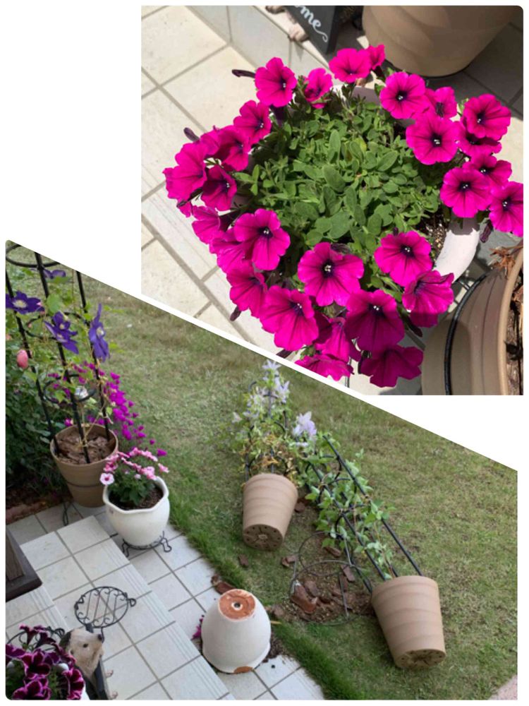 ペチュニアは鉢がかけましたが なんとか無事。クレマチスは 枝が数本折れました。挿し木にしたけど、、、