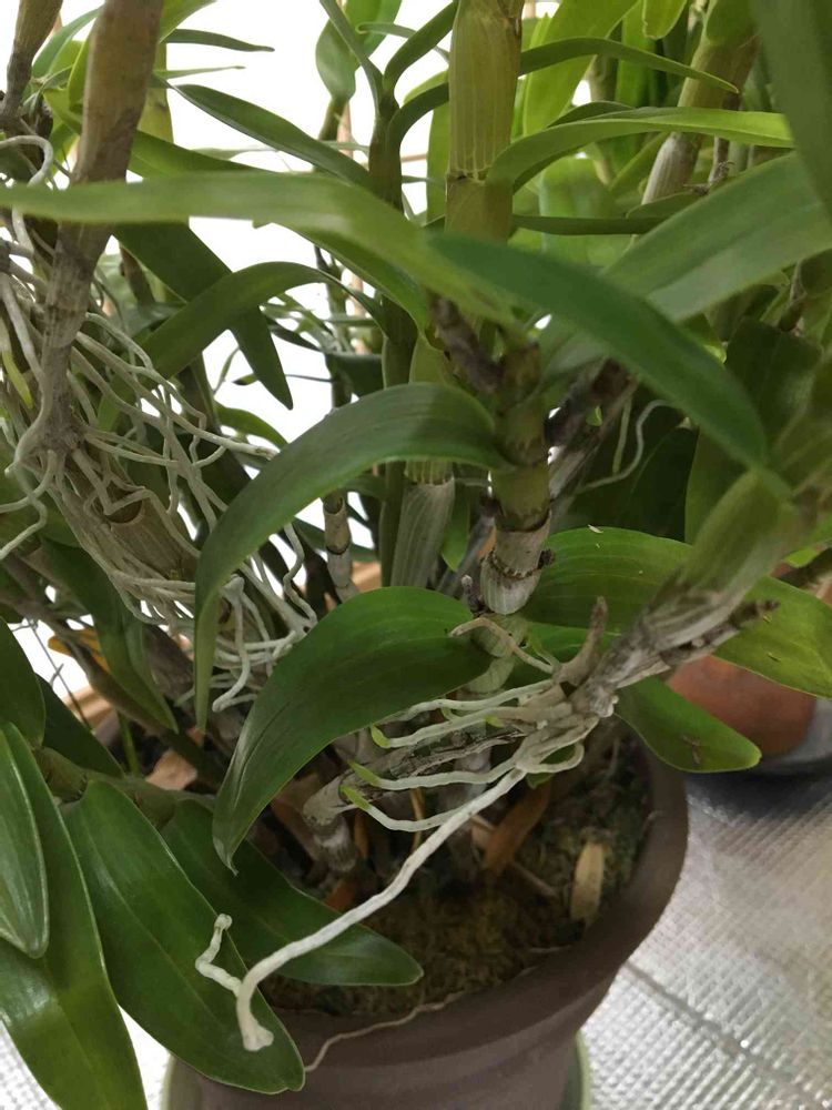 今のデンドロビウム、こんな状態です。この先白い根はどうしたらいいのでしょうか?株分けした方がいいのかな?