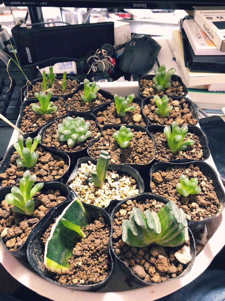 こちらハオルチア コンゲスタ ハオルチア オブツーサ ハオルチア 玉扇 サンセベリアです。腰水で育てておりかなり楽に!一番心配したのがサンセベリアで、母が育ててたサンセベリアが腐ってしまいなんとかならないかとネットで調べたら葉わけができることを知りすぐに切り取り作業をしルートンを付け赤玉土に挿しました。作業してから5ヶ月がたちついに芽が出ました!生命力がすごい!