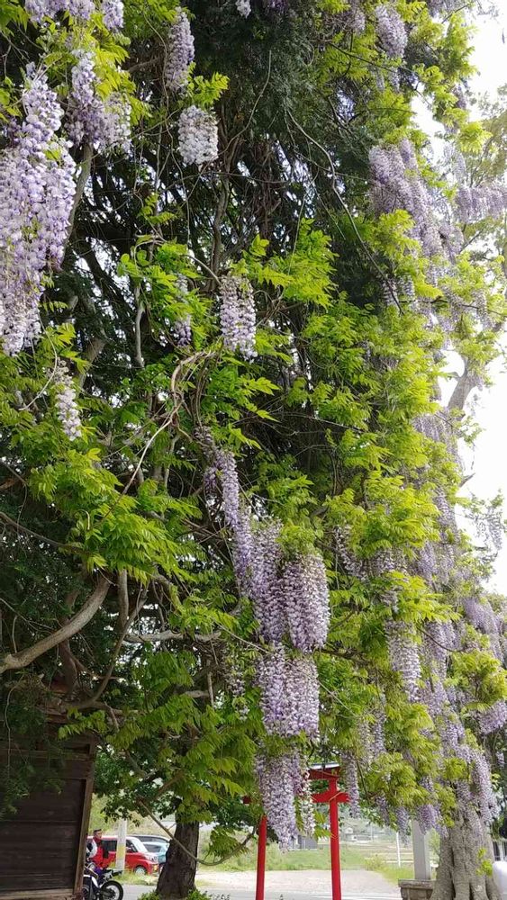 樹齢約500年のカヤに 絡んだ藤の花です 大きくて1枚に収まりませんでしたが撮りかた下手でこの1枚に😚