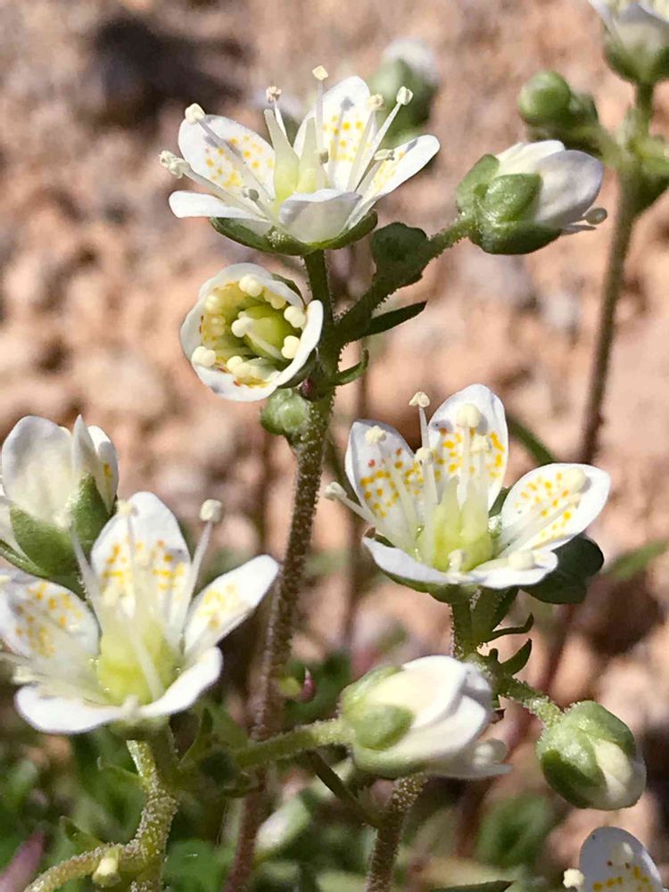 花は白色、花弁に爪が無く内側に黄斑と紅斑があります。葉は肉質で1〜3ミリ、全縁、縁に10数対の剛毛があります。