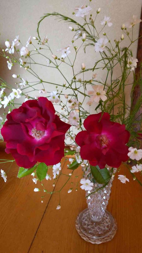 庭に咲いた「真っ赤なバラ」畑に咲いた「白いかすみ草」と「アスパラガスの葉」を玄関に飾りました!